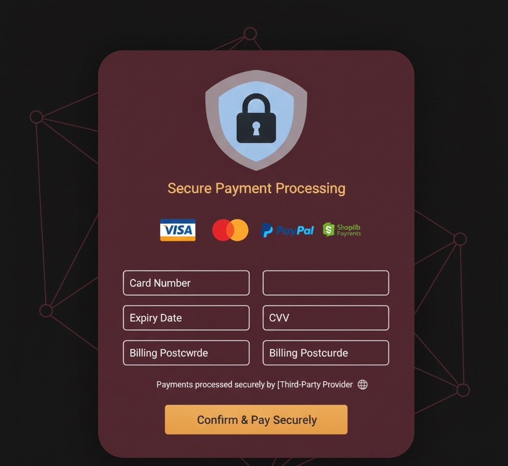We accept payment through Shopify Payments, PayPal, Visa, MasterCard. Your payment is processed securely by our third-party payment providers. We do not store your full financial details.
