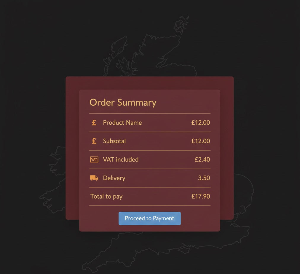 All prices are shown in Great British Pounds (£) and include VAT (where applicable) at the current UK rate. Delivery charges will be added during the checkout process and clearly itemised before final payment.